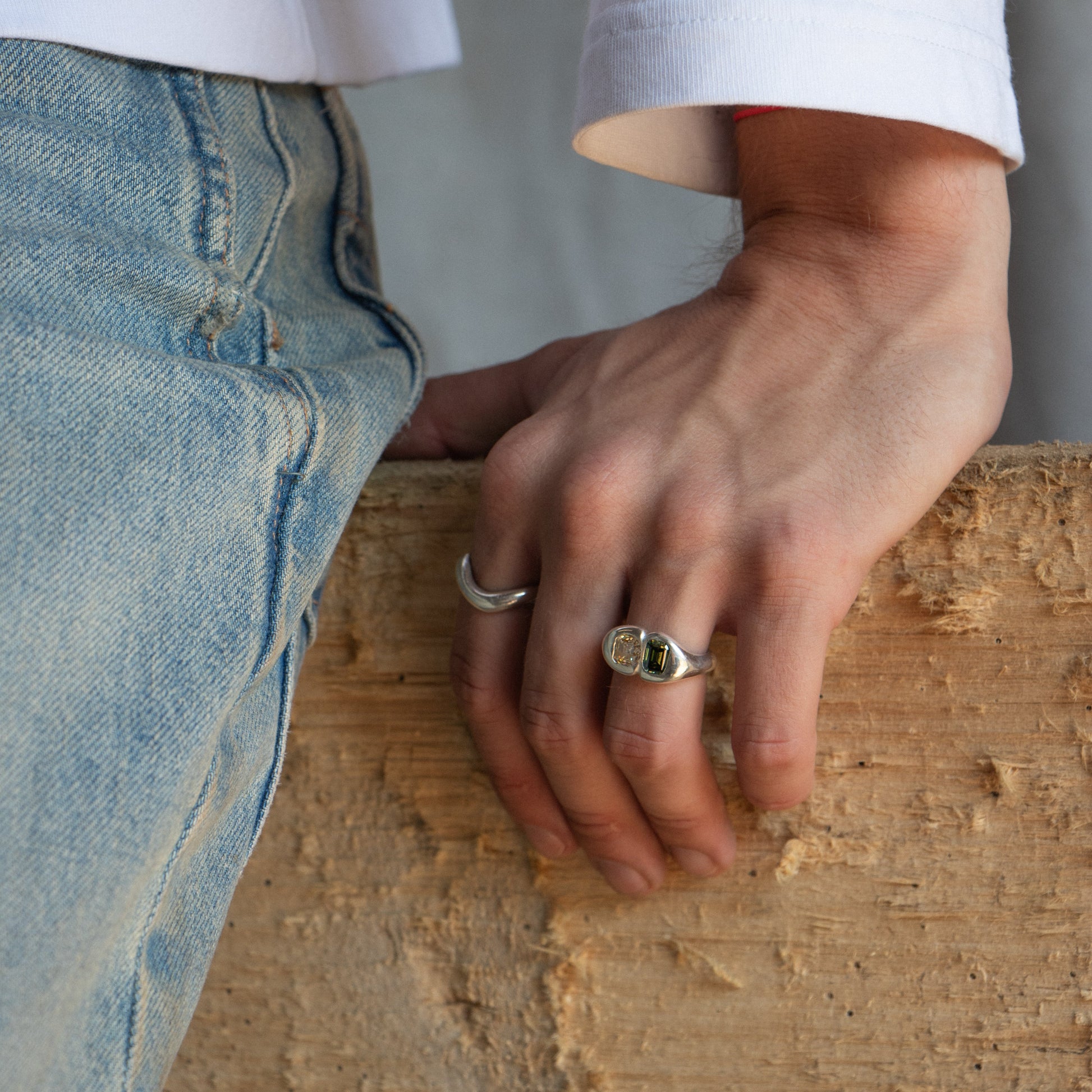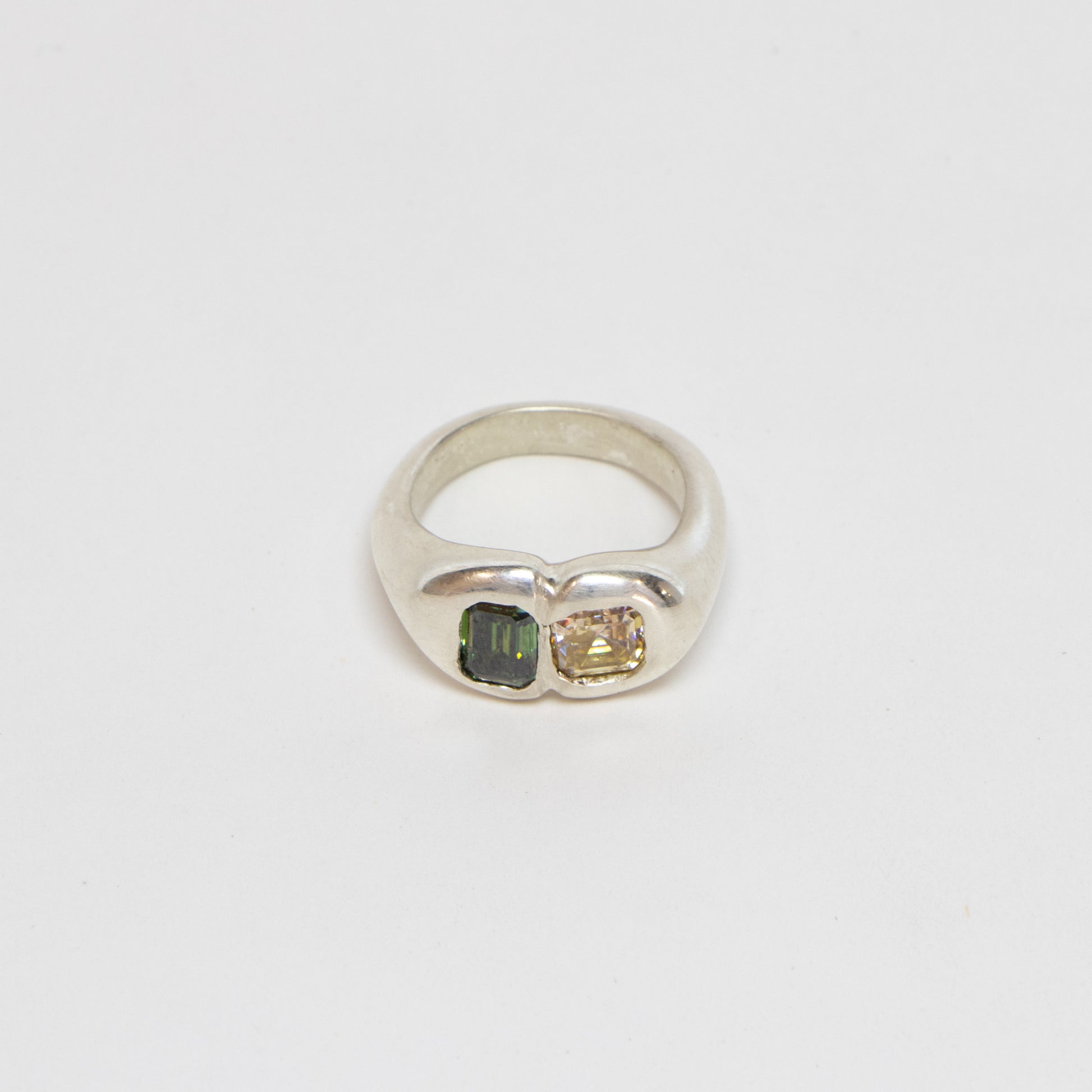 Deze handgemaakte ring van Simon Paul is gemaakt van 100% sterling zilver en is voorzien van twee moissaniet-edelstenen in geel en donkergroen. Aan de binnenzijde van de ringband is het “SimonPaul” logo gegraveerd.